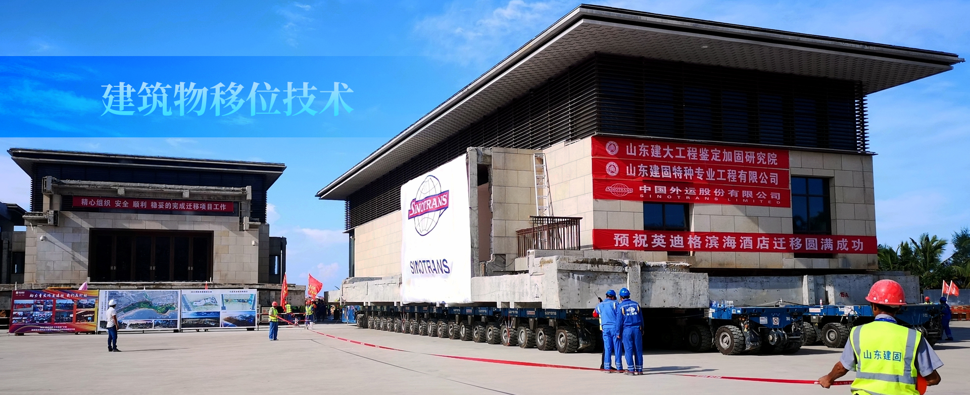 海南紅塘灣酒店為地下1層、地上2層鋼筋混凝土框架結(jié)構(gòu)。占地面積約2400㎡,總建筑面積4658㎡。遷移直線距離約500米,豎向頂升2.3米。紅塘灣酒店遷移工程的成功就位,標(biāo)志著一個(gè)新的記錄誕生:目前國內(nèi)外首例不規(guī)則扇形車輛布置、國內(nèi)拖車移位單體建筑面積最大(4658㎡)、國內(nèi)拖車移位單體建筑重量最重(7500噸)。山東建筑大學(xué)工程鑒定加固研究院、山東建固特種專業(yè)工程有限公司成立于1992年,三十年一直秉承“篤志疑難躬行求新”的企業(yè)精神,完成建筑物鑒定與加固改造、建筑移位、建筑糾傾項(xiàng)目六萬余項(xiàng)。山東萊蕪高新區(qū)辦公樓平移項(xiàng)目,建筑面積24000㎡,重量35000噸,是國內(nèi)外最重平移工程;主持完成的